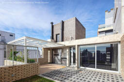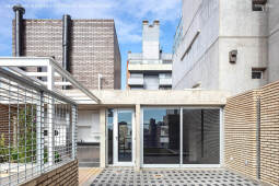 Por el contrario, las viviendas funcionan como contenedores introvertidos, que se cierran al sur y se abren hacia el norte. Para ello, las aberturas y los balcones se unifican en un gradiente de ranuras de distintas densidades que funcionan como filtro climático y resguardo de la intimidad, en una cuadra repleta de edificios al frente. En el fondo del lote la masa edilicia se organiza en torno a un patio que permite iluminar y ventilar los espacios del contrafrente del edificio hacia el norte y hacia al este.