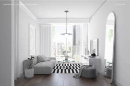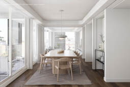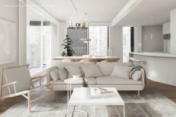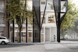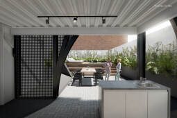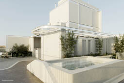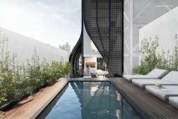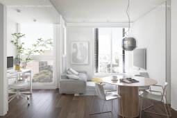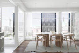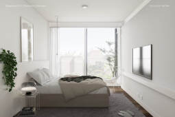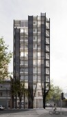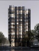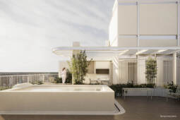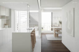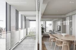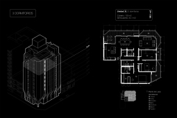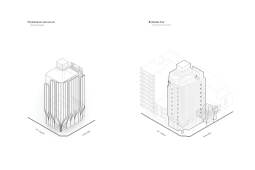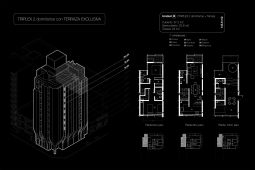 En continuación con la lógica de investigación sostenida por la oficina, el proyecto propone diversas configuraciones tipológicas, comprendiendo unidades de uno, dos y tres dormitorios. Las unidades de dos dormitorios presentan una configuración flexible que permite transformarlas en tres dormitorios, respondiendo a las exigencias del habitar contemporáneo, que presenta estructuras familiares dinámicas. A su vez, se plantean terrazas accesibles en los últimos niveles, con vistas panorámicas al parque Independencia y la ciudad en su conjunto.